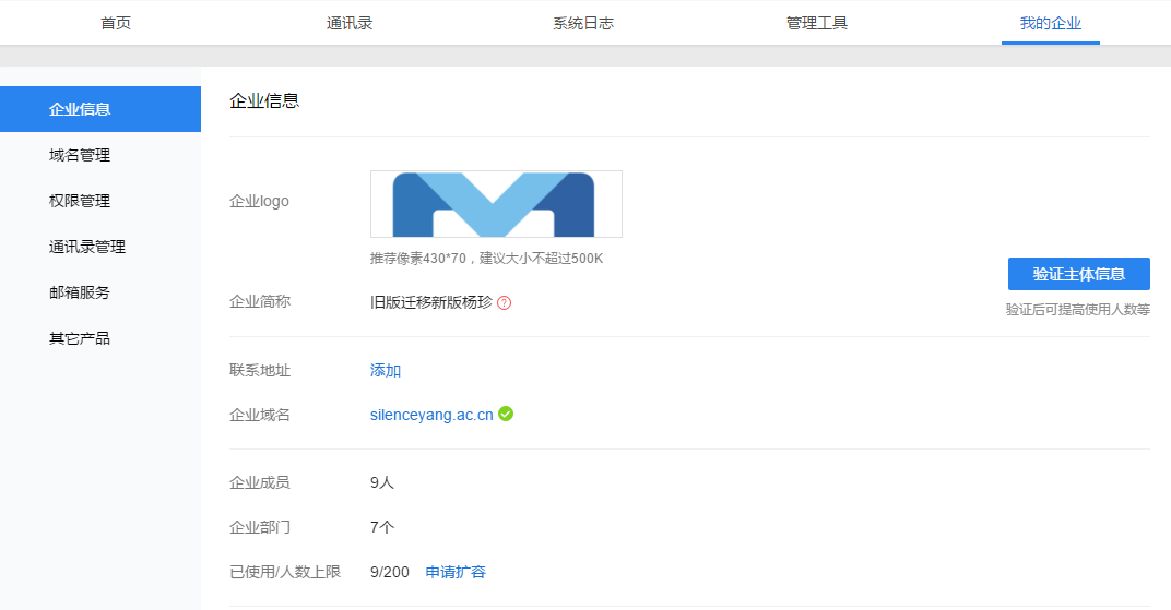 验证主体或企业微信认证通过后,可以登录管理端-我的企业-企业信息-已使用/人数上限申请扩容。