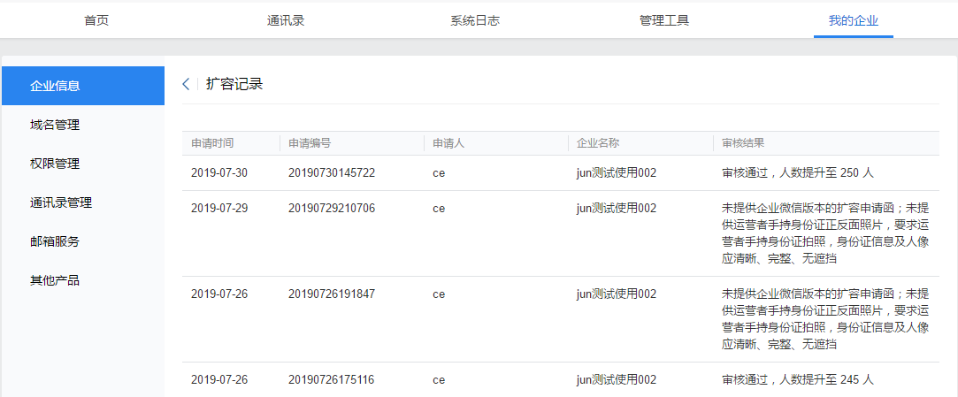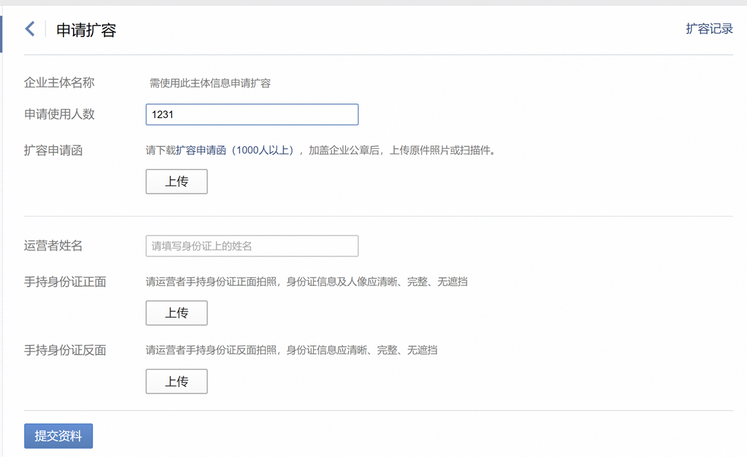 验证主体后,提交申请人数、扩容申请函、运营者身份证信息等资料提交。审核团队会根据企业的使用和资金等按标准判断是否通过,并通过邮件通知管理员邮箱。
