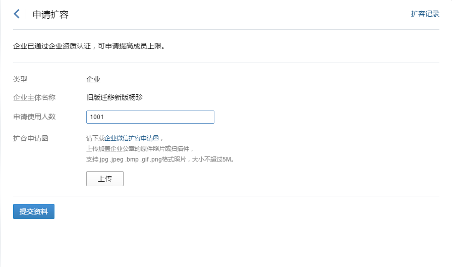 验证主体后,提交申请人数、扩容申请函、运营者身份证信息等资料提交。审核团队会根据企业的使用和资金等按标准判断是否通过,并通过邮件通知管理员邮箱。