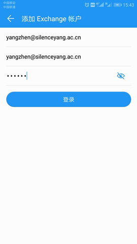 1.主菜单选择“电子邮件”跳转至“添加账户”,选择“Exchange”,输入完整电子邮件地址、用户名、密码后,点击“登录”