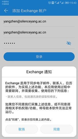 2.选择“登录”后,会弹框提示Exchange通知,选择“同意”,页面跳转至账户设置,根据提示输入电子邮件地址、域名、用户名、密码以及服务器(填写ex.exmail.qq.com)、端口选择默认443、安全类型默认SSL/TLS后,点击“下一步”
