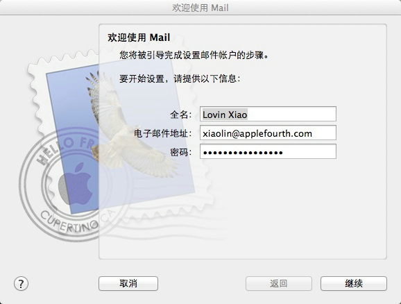 1.进入mail客户端,[添加帐号],填入完整的电子邮件地址跟密码。