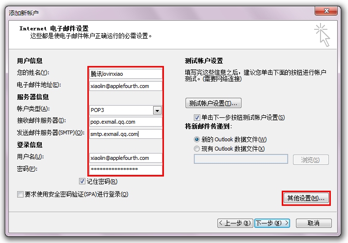 在“添加新账户”窗口中,输入您个人的“用户信息”、“登录信息”,而“服务器信息”则按照页面的提示进行填写。