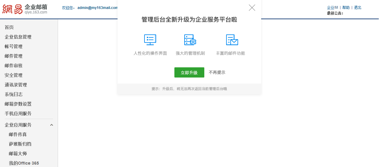 近日,网易企业邮箱管理后台已支持在线自助升级至全新“企业服务平台”。当管理员登录原有管理平台后,系统会提示在线升级,可一键升级至全新版本。升级后,灵活的组织架构、丰富的权限管理以及多项创新功能,将给企业带来便捷高效的办公体验。