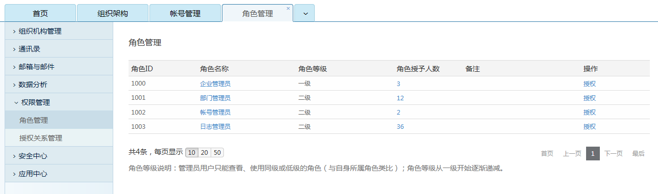 正因为企业更为复杂和灵活,在管理上分工更细化,需要更开放的权限:在企业管理员、部门管理员角色的基础上,新增了日志管理员、帐号管理员等角色,让分工管理更高效。