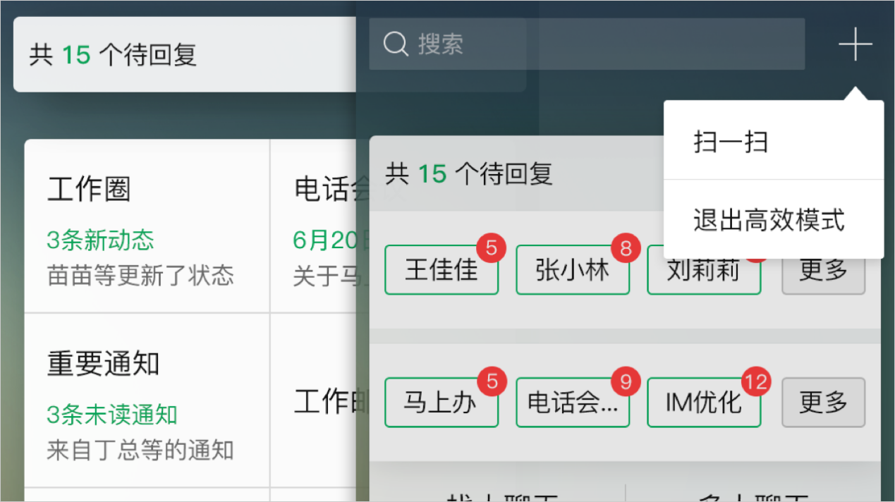 为了让企业用户在每天有限的工作时间内高效率的完成工作项目,“马上办”的移动端默认开启高效模式,集中聊天、应用功能于一屏,让您处理工作更迅速。