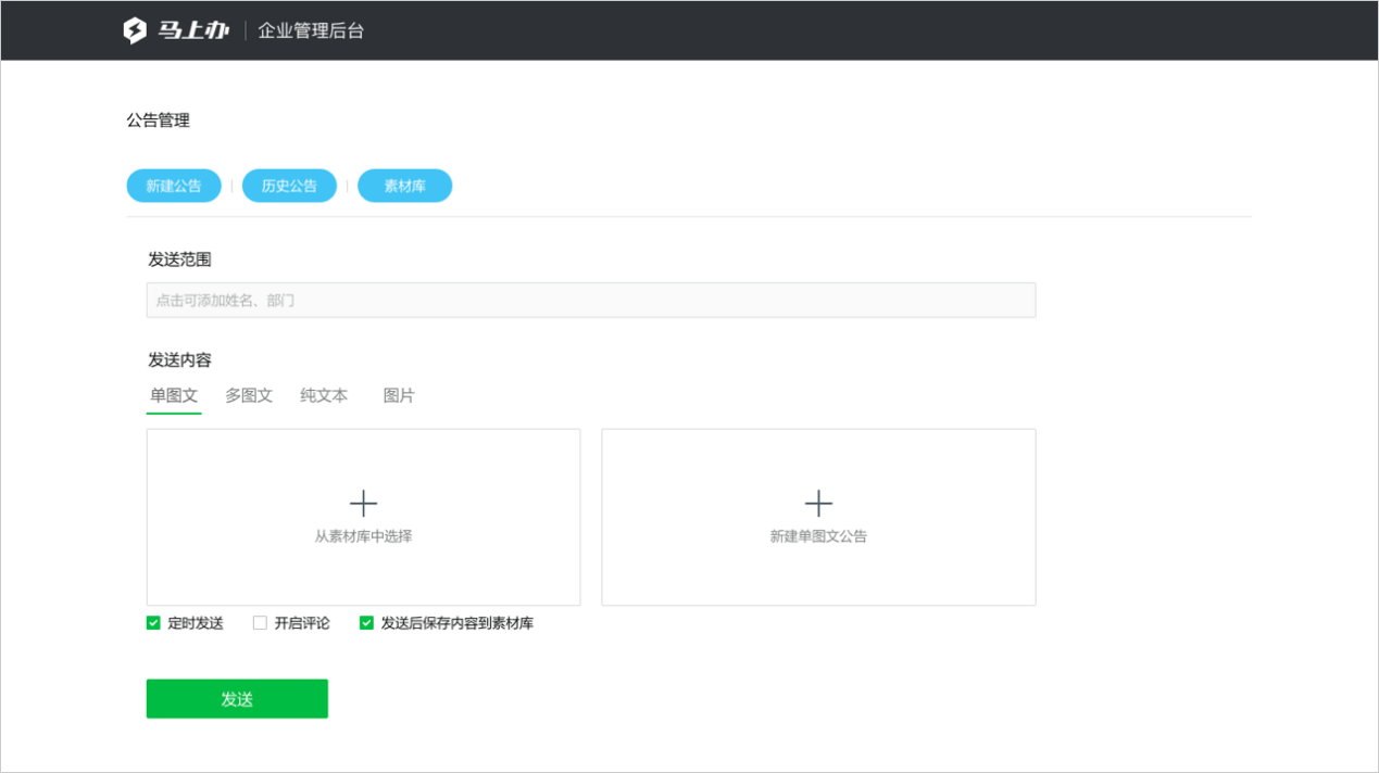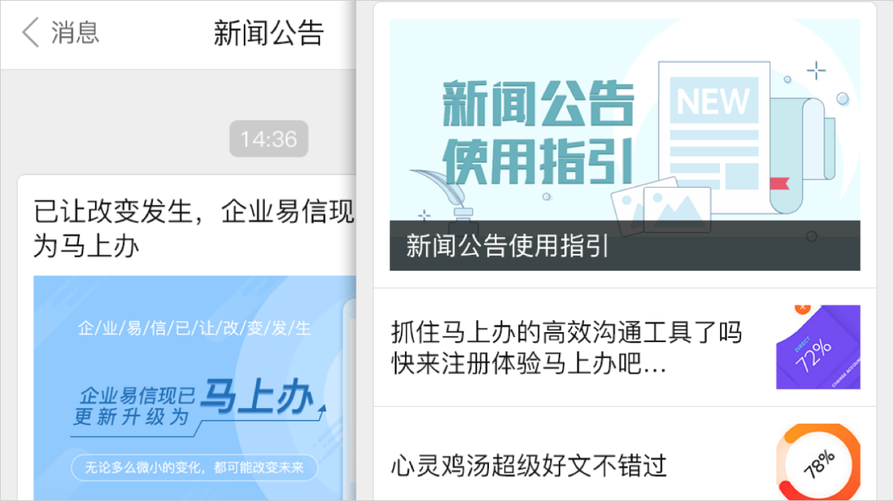 “马上办”的管理后台新增应用--新闻公告,丰富的公告类型让您的企业轻松发布内部公告、通知活动、分享好文等。可在管理后台中进行设置,使企业信息更加可控,全员可见的公告传播方式,使各类信息无缝传递。