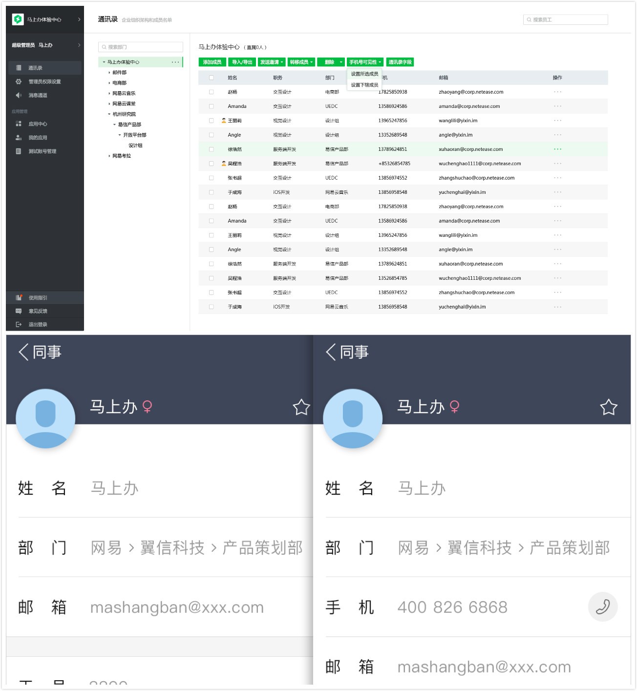 企业员工的个人的手机号码信息,属于较隐私信息,需要个性化设置加以保护, “马上办”管理后台新增功能--手机号可见性设置:管理员可以设置公司成员手机号在客户端中是否对他人可见。管理功能更加人性化,细致之处更加体现产品对企业场景的适用性。