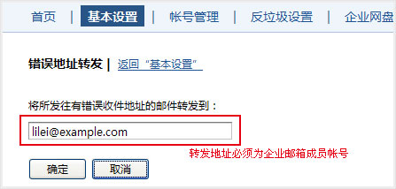 企业管理员可指定一个邮箱(必须是企业邮箱已经存在的帐号)来收取发往错误地址的邮件,后续此类邮件就会自动转发到指定邮箱里。