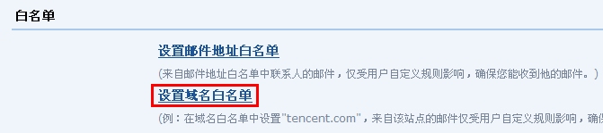1,在“邮箱设置”->“反垃圾”->“白名单”栏目中,点击“设置域名白名单”。