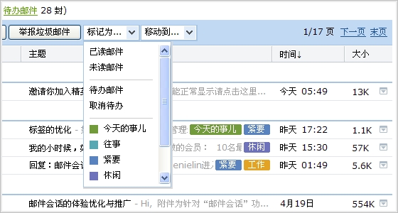比起文件夹方式的管理,标签管理的优点是一封信可以设定多个不同的标签。试试给邮件打上标签,公务还是私事,紧急的还是先缓缓的,一目了然。