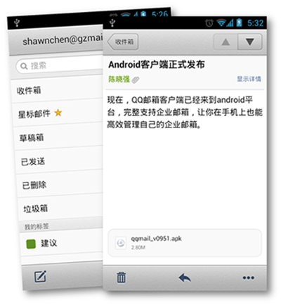 现在,QQ邮箱客户端已经来到android平台,完整支持企业邮箱。您只需填写腾讯企业邮箱帐号、密码,即可登录使用。