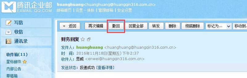 2.撤回仅限于发往腾讯企业邮和QQ邮箱的邮件,不支持撤回发往如网易、Gmail等其它邮箱的邮件;
