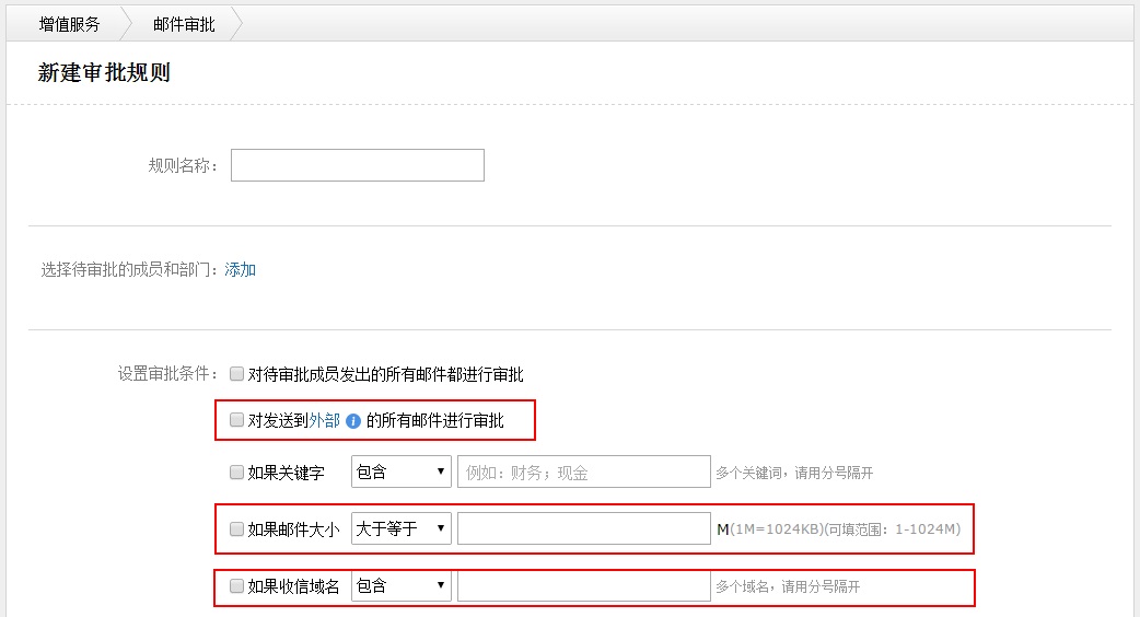 (2) 丰富了审批规则的选项,增加了包括“邮件大小”、“收信域名”、“发送到外部的所有邮件”的审批选项,如下图: