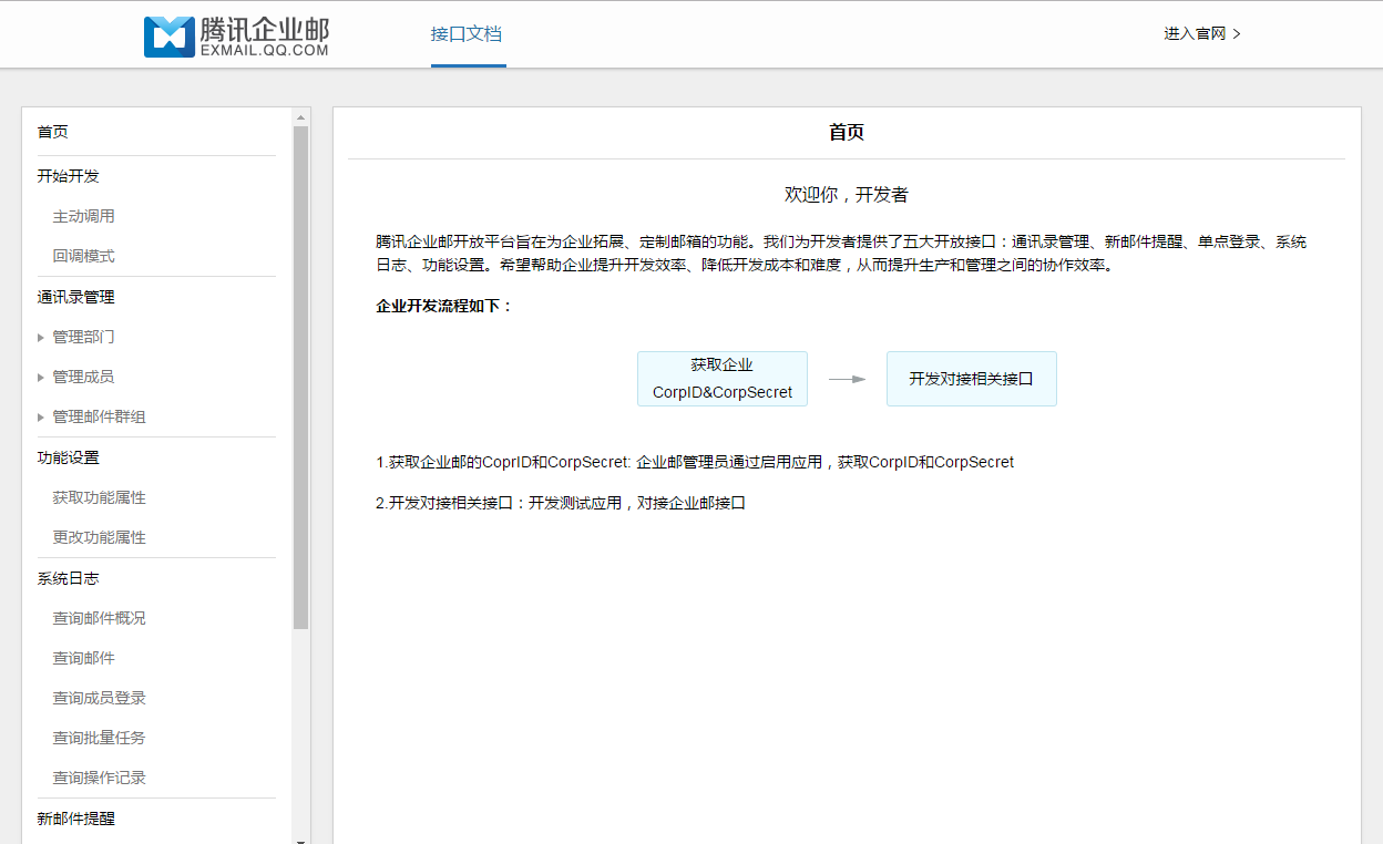 (2) 企业邮官网新增“开发者中心”入口,提供新API接口详细的文档规范,如下图: