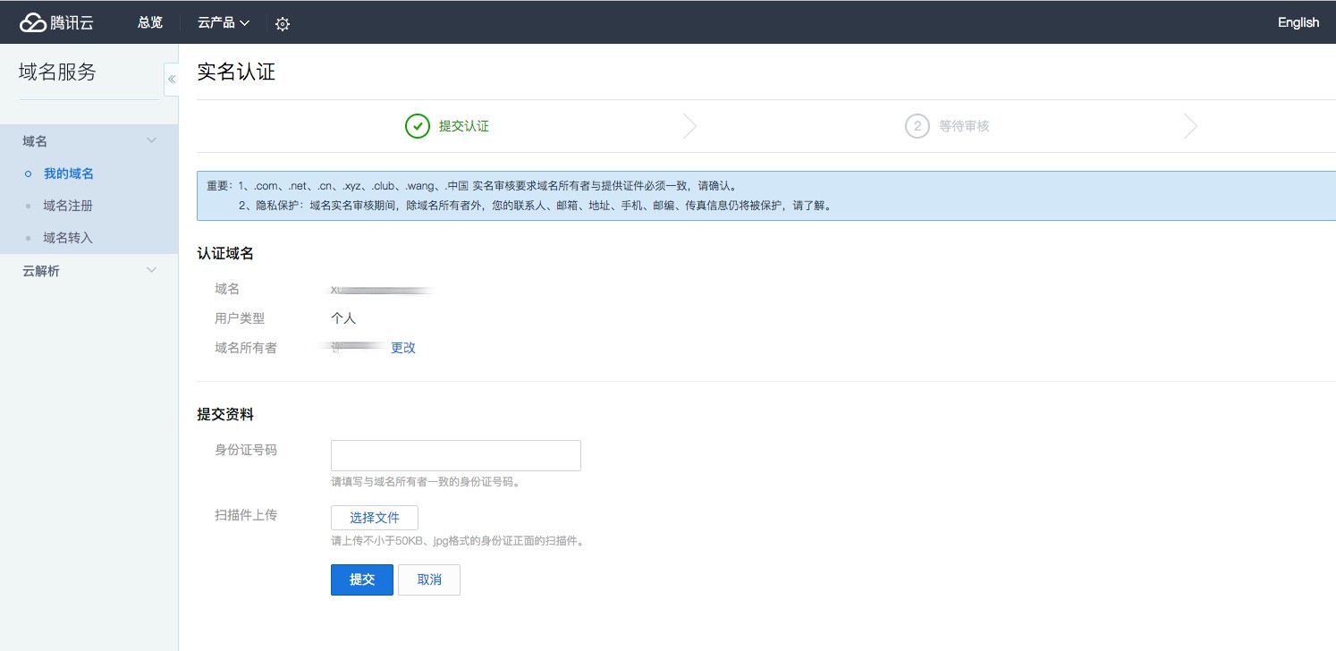 1)个人用户:需要提交与域名所有者身份一致的身份证正面扫描件(注:为了提升审核准确率及速度,建议您提交身份证扫描件,避免用拍照的方式),操作展示如下: