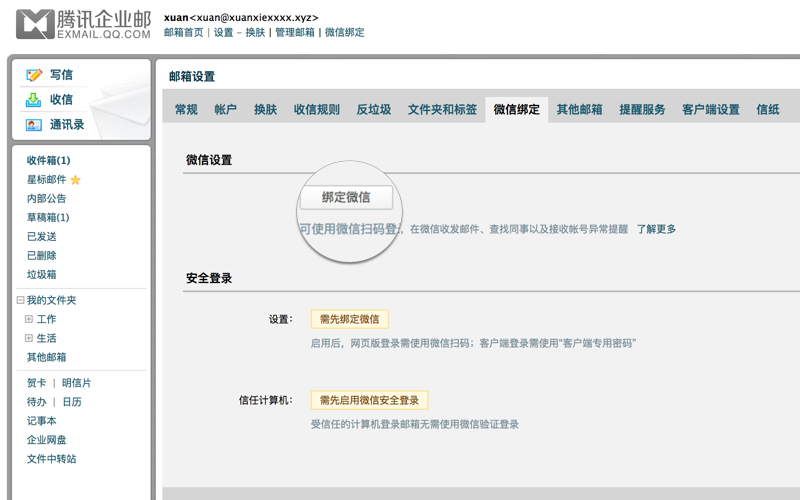 1.企业成员登录邮箱后,选择帐号下方的“微信绑定”入口或者进入“设置”-“微信绑定”-“微信设置”,点击“绑定微信”。