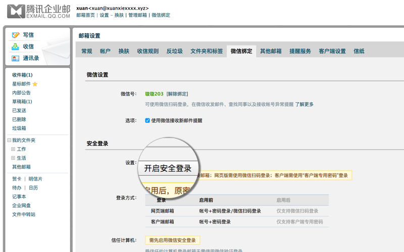 开启后,将进一步保障你的帐号安全,登录方式升级为:网页端登录需使用微信扫码;客户端登录需使用“客户端专用密码”, 更有效保障你的邮箱安全。