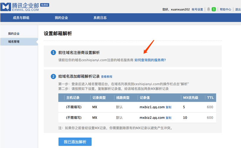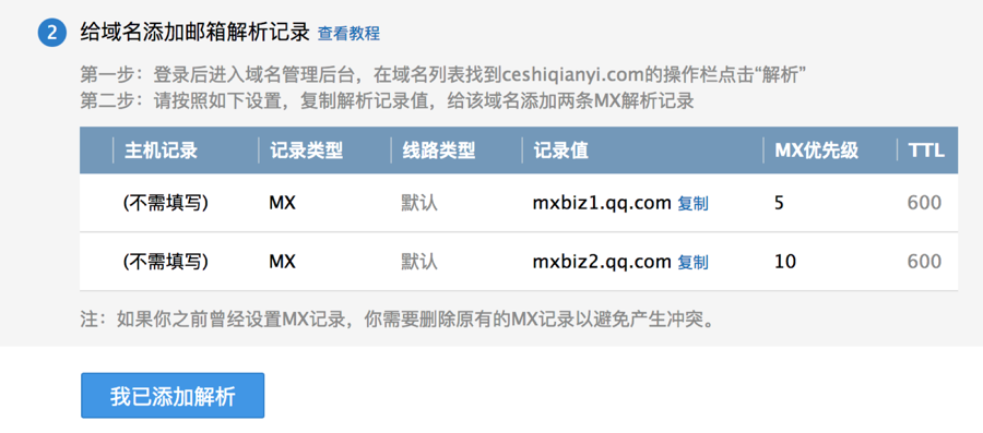 二、选择了使用已有域名,需要对域名进行邮箱解析,流程如下: