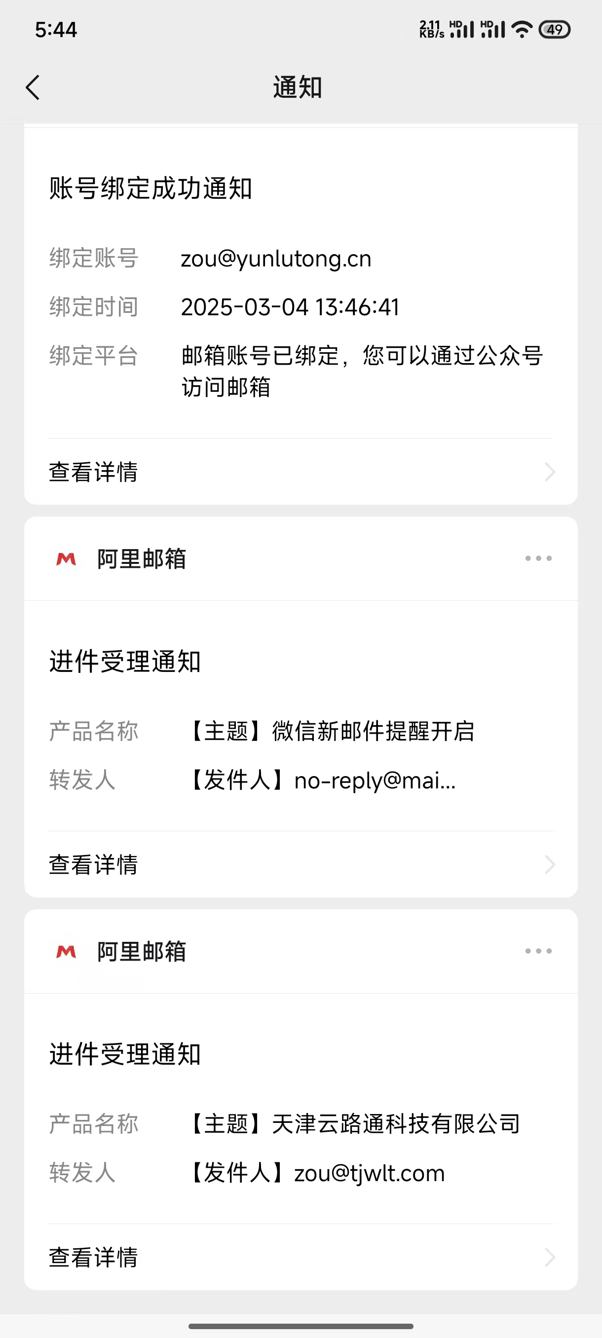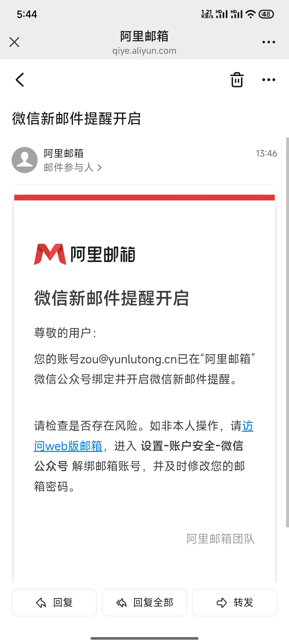 1:微信搜索 阿里邮箱 公众号后,关注成功后,直接绑定阿里企业邮箱;
