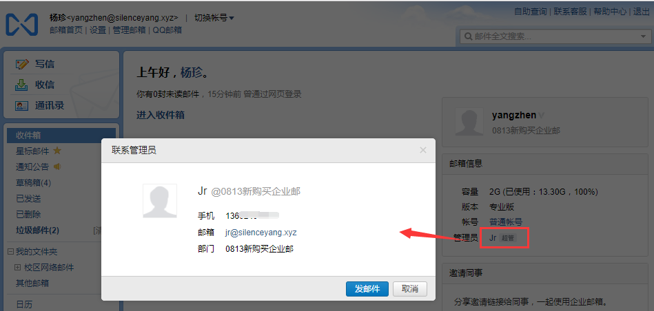 网页登录邮箱,在首页右侧-邮箱信息-管理员,可以通过邮件方式联系邮箱管理员。