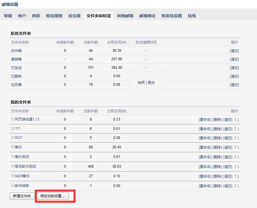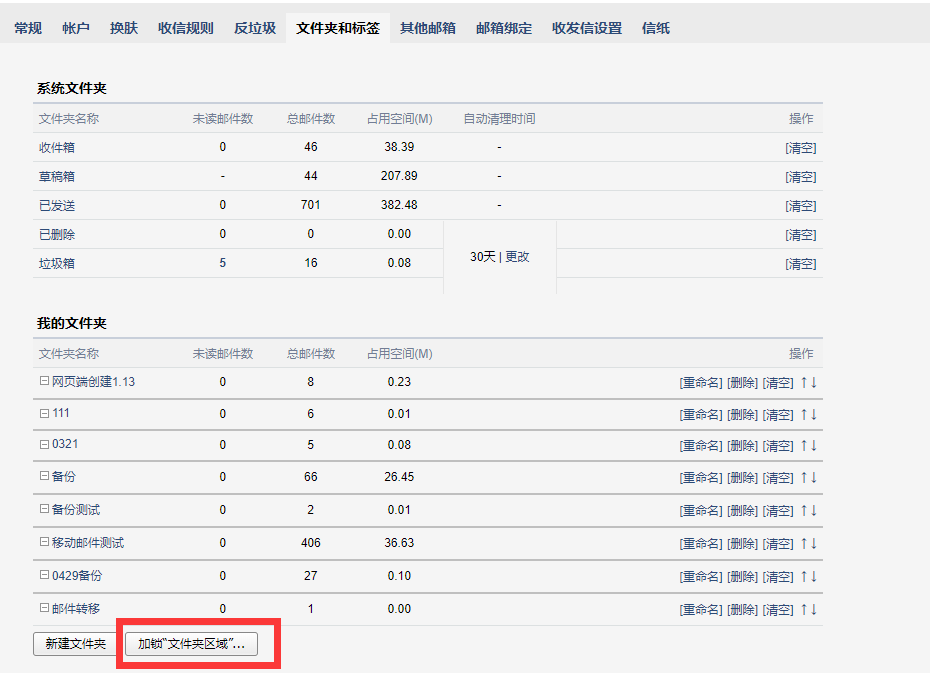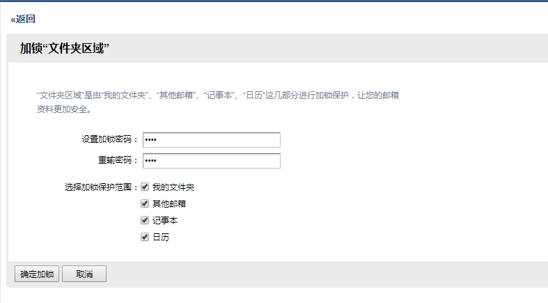网页登录成员邮箱后,在首页设置-文件夹和标签-选择“加锁文件夹区域”进行设置我的文件夹/其他邮箱/记事本/日历密码。