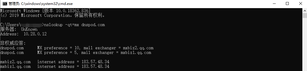 单击确定,在打开的窗口中输入“nslookup -qt=mx 域名”,即可看到您域名的 MX 记录。如下图所示: