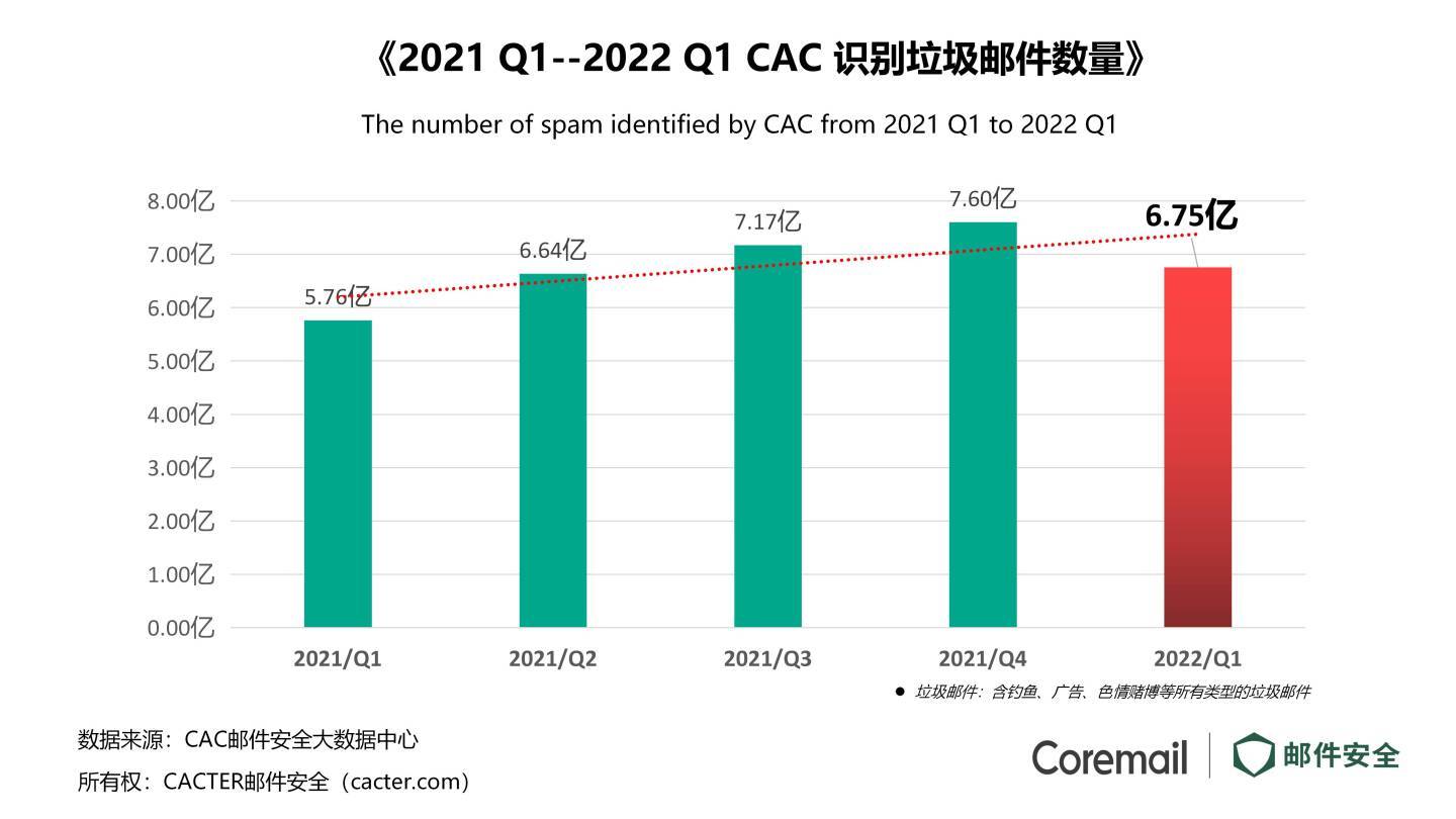 根据CAC大数据中心评估,2022 Q1季度全国企业邮箱用户共收到各类垃圾邮件6.75亿封,同比增长17.28%。