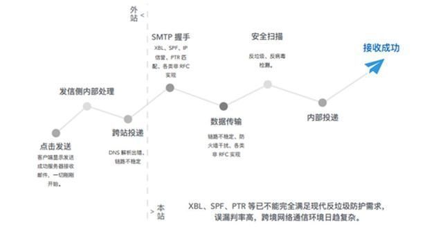 如图所示,链路中的每一步都有可能导致海外邮件接收的失败,可谓一步出错,满盘皆输。