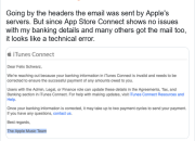 大量的苹果用户被错误地发送了关于iTunes Connect账单或银行信息的电子邮件--即使他们不是iTunes Connect用户。在2022年7月27日的几个小时内,错误的iTunes Connect邮件被大量发送。所有收到的用户随后不久就收到了道歉信,但即便是道歉过程也出了错,一些并没有受到影响的账户也收到了错误的道歉信。iTunes Connect发出的警告涉及到银行信息,用户被告知,他们