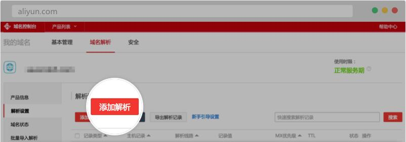 第二步:点击管理控制台左边主导航栏【产品与服务】—【域名】,在域名列表点击【解析】
