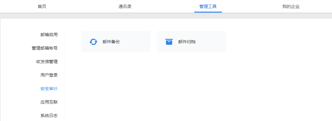 登录管理员后台,点击管理工具-安全审计-邮件归档,为邮件归档系统设置归档管理员。设置成功后,系统将发送激活邮件至该归档管理员邮箱。