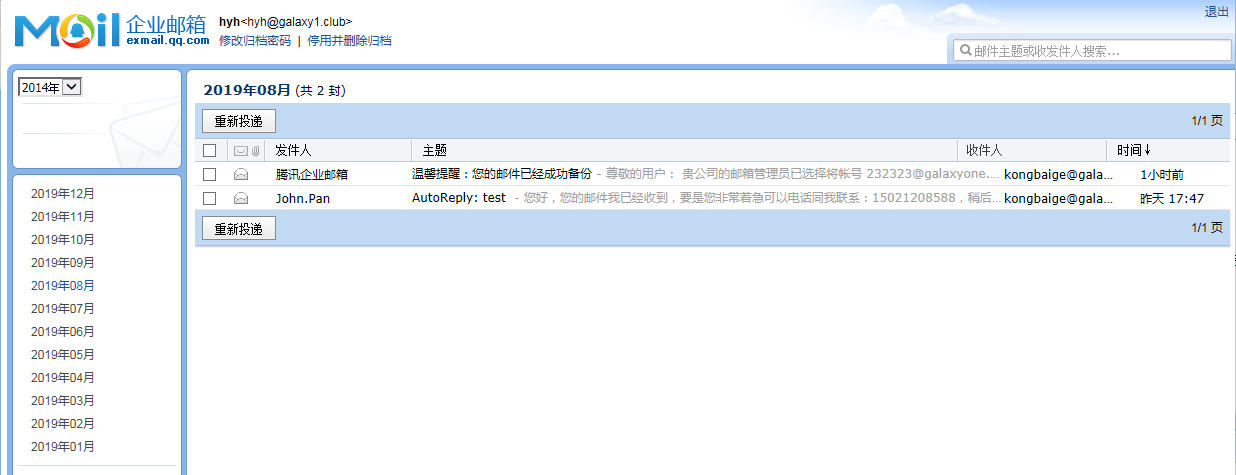 登录邮件归档系统后,可查看公司所有邮件往来记录详情(功能未开启及关闭期间的邮件不进行归档),重新投递邮件。重新投递只会把所选邮件重新发送给邮件收件人中的域内成员。