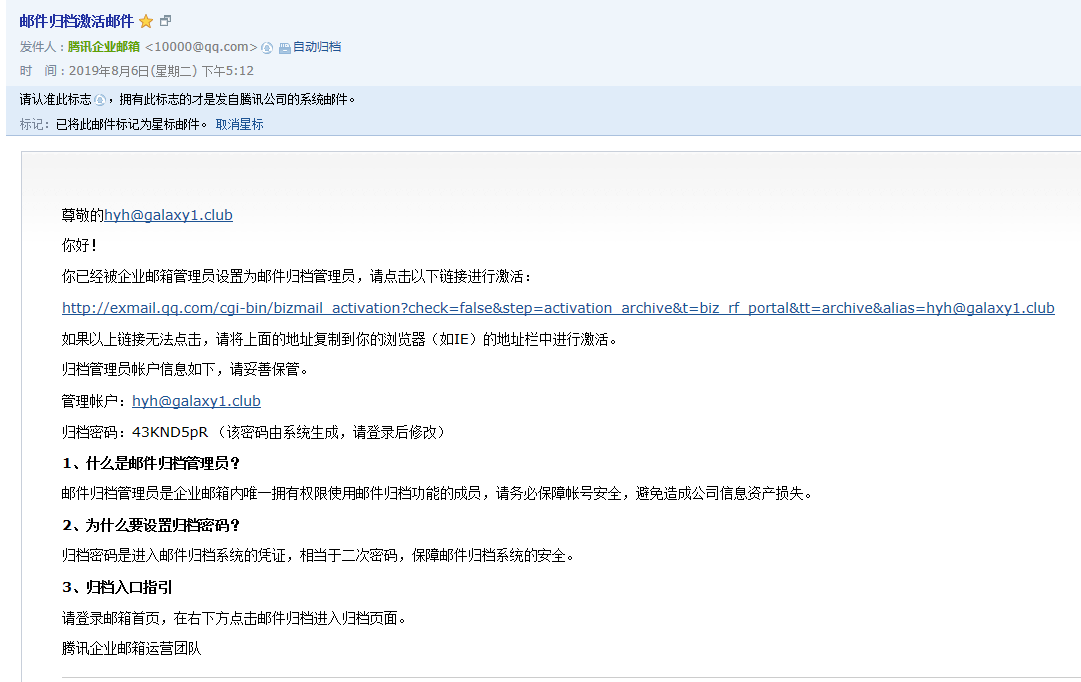 归档管理员查收激活邮件,点击邮件中的激活链接,成功开启邮件归档功能。