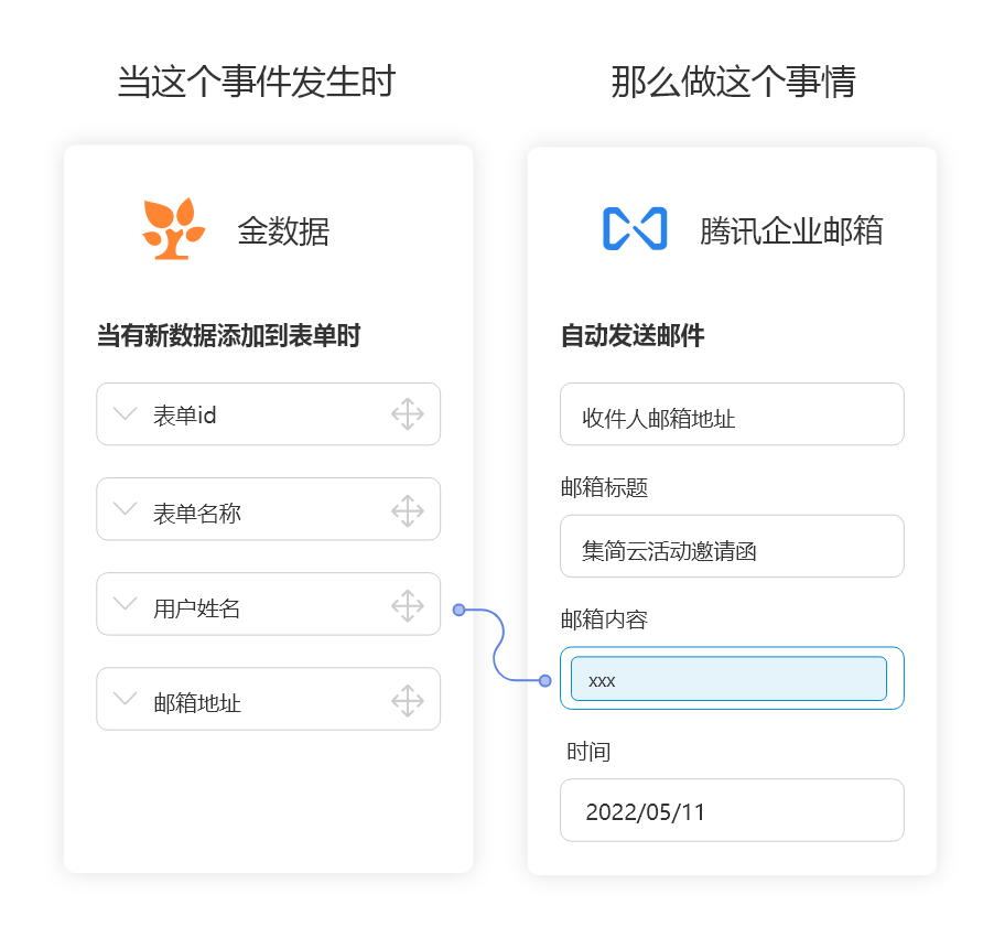 实现目的:每当有用户提交金数据活动报名表时,腾讯企业邮箱自动发送一份邀请函邮件,无需人工再一一确认进行发送,省时省力,且大大提高企业人员的工作效率。