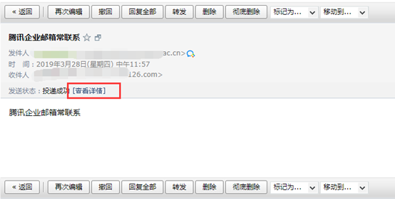 查询方法:在“已发送”邮件箱中点击任意一封邮件,就可以在邮件的信头和内容之间看到“发送状态”,点击“查看详情”可看到该邮件的详细发送状况。若“投递失败”您可以查看详细信息,解决后使用“再次发送”功能再次发送邮件。