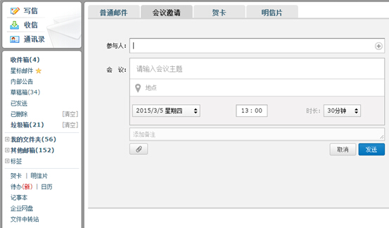 2.输入参与人邮箱地址,会议主题,时间和地点后点击发送即可。