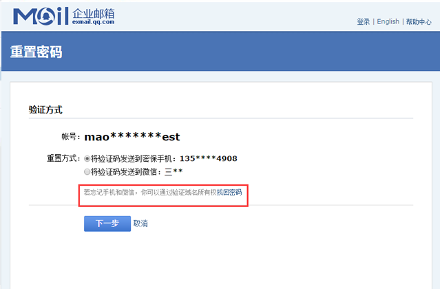 如果您的管理员帐号已添加域名,但是没有绑定微信或是手机或是已绑定的手机或是微信不可用,您可通过验证域名所有权的方式重置密码,操作步骤如下: