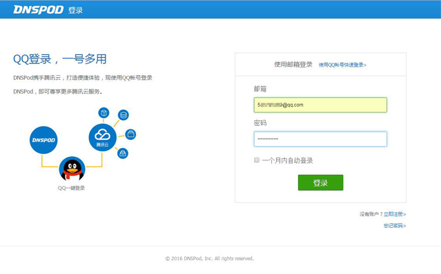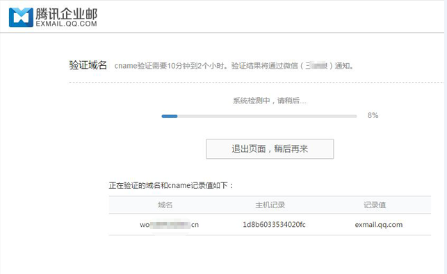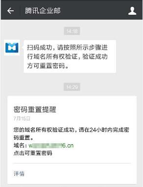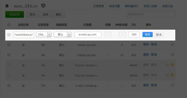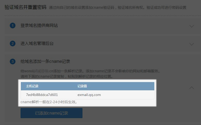 3. 使用微信扫码验证身份 4. 验证域名所有权:您需要在您的域名注册商提供的管理页面,为您的域名增加一个cname记录: 以DNSPod为例,操作步骤如下: (1)登录DNSPod域名管理帐号: (2) 在“域名解析“中点击对应域名添加一条came记录值后保存: 注:cname记录值不可以随便填写,请在企业邮箱重置管理员密码界面的步骤三中找到要求设置的came记录,复制黏贴到域名解析设置的相应位置。 (3)等待cname记录生效 (4) Cname记录生效需要几分钟到2小时,具体时间取决于您的域名服务提供商。Cname验证结果我们会通过您扫码验证时使用的微信通知您 (5)域名验证成功后您即可重置密码: (6)重置密码成功