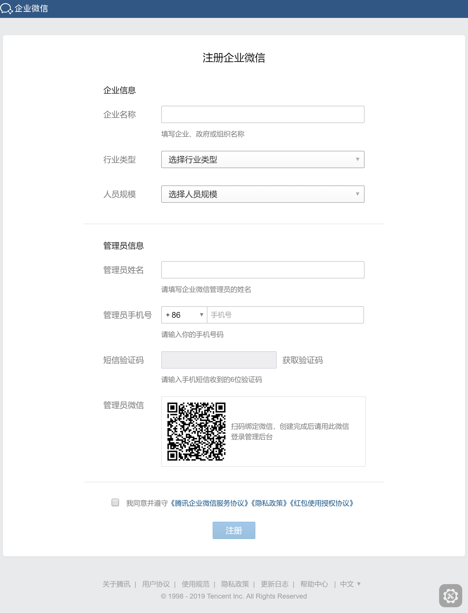 如选择“新开通企业邮”,那么需要依次输入企业名称、管理员姓名、管理员手机号,短信验证码,并使用管理员的微信扫码完成注册。