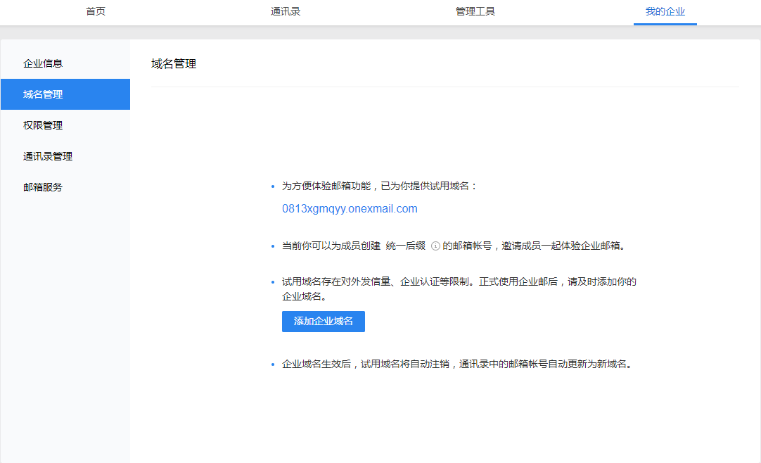 第五步:登录企业邮管理后台,并添加企业域名。进入管理后台-域名管理,添加企业域名。