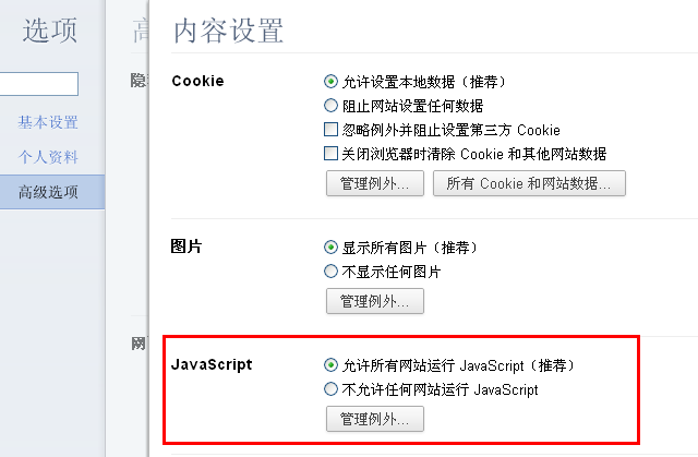 更改内容设置,在内容设置窗口,选择“允许所有网站使用Javascript”: