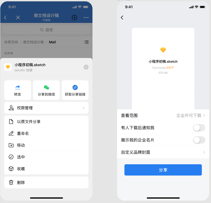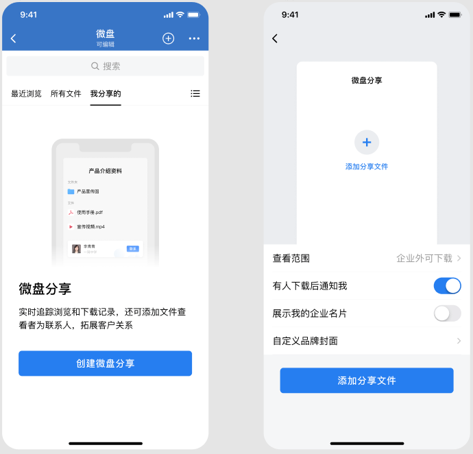 通过微盘分享文件,可以配置下载通知、查看范围、企业名片、品牌封面等功能。