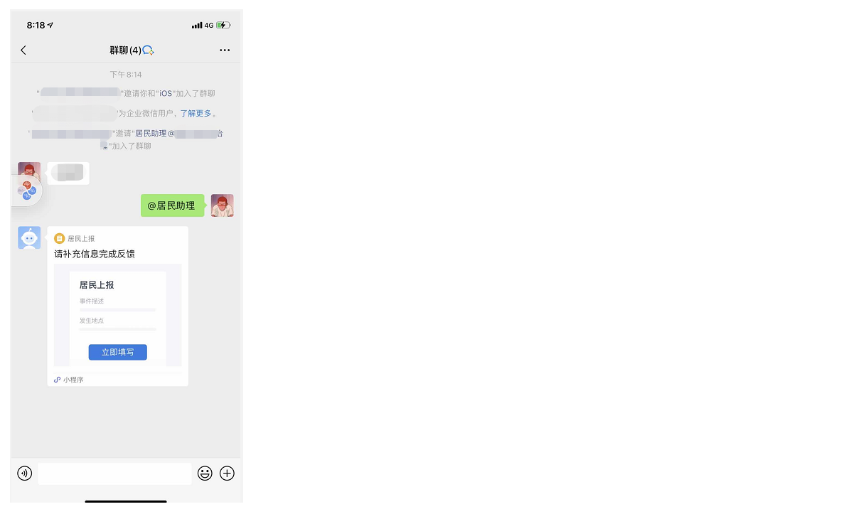居民可在居民群中@助理机器人,通过机器人发送的小程序提交上报