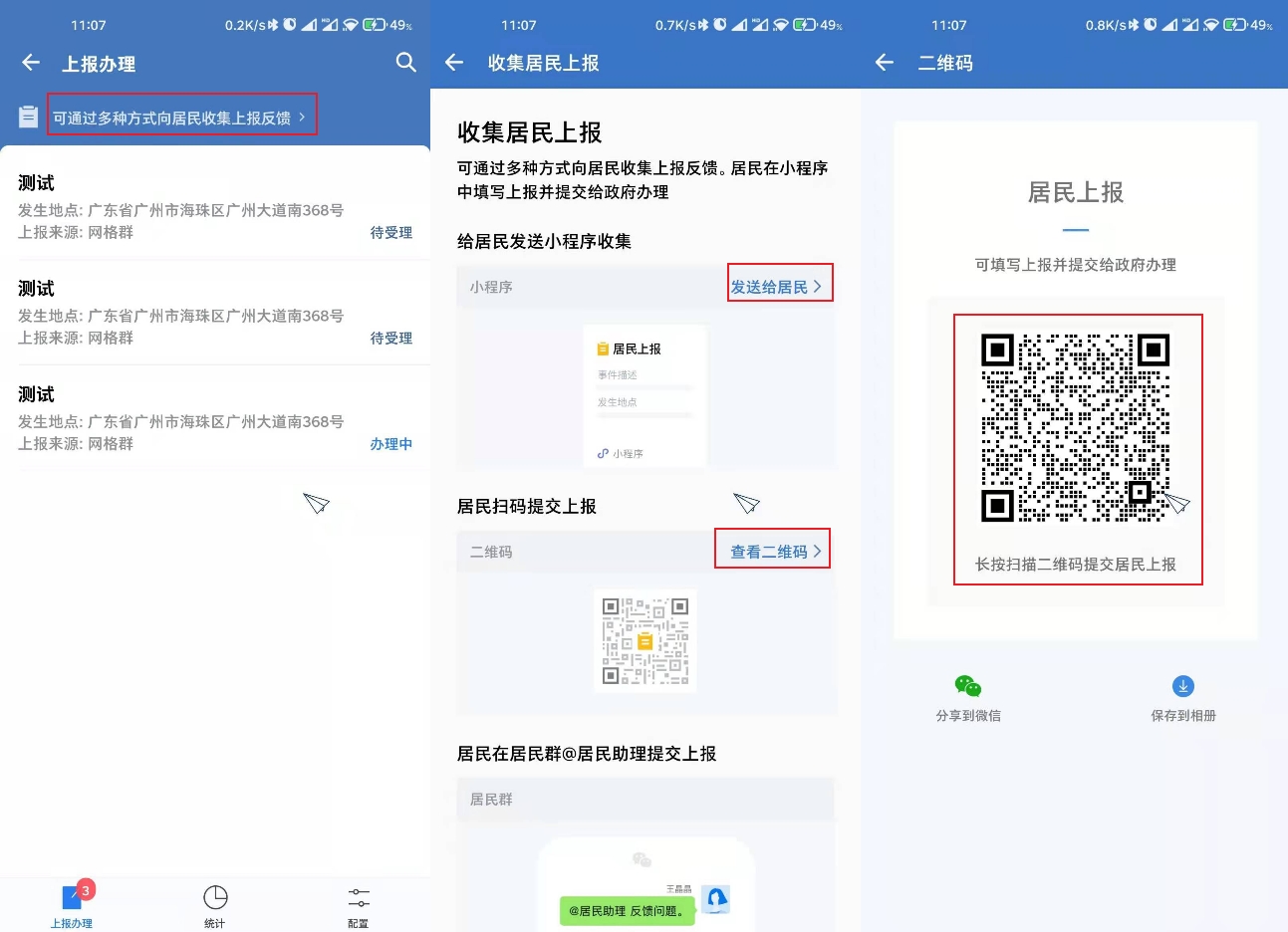 成员可点击工作台「居民上报」应用中的分享入口,发送小程序或二维码到微信侧会话中