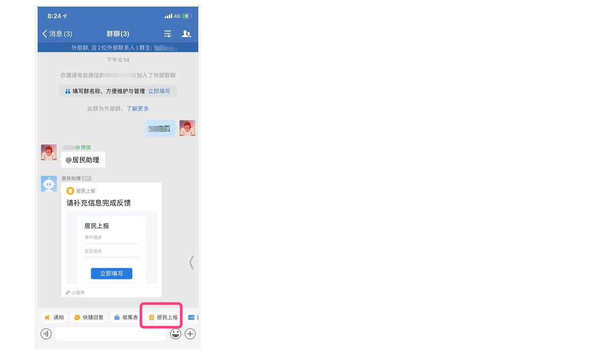 成员可在企业微信侧居民群工具栏中,点击「居民上报」应用发送小程序到群聊中