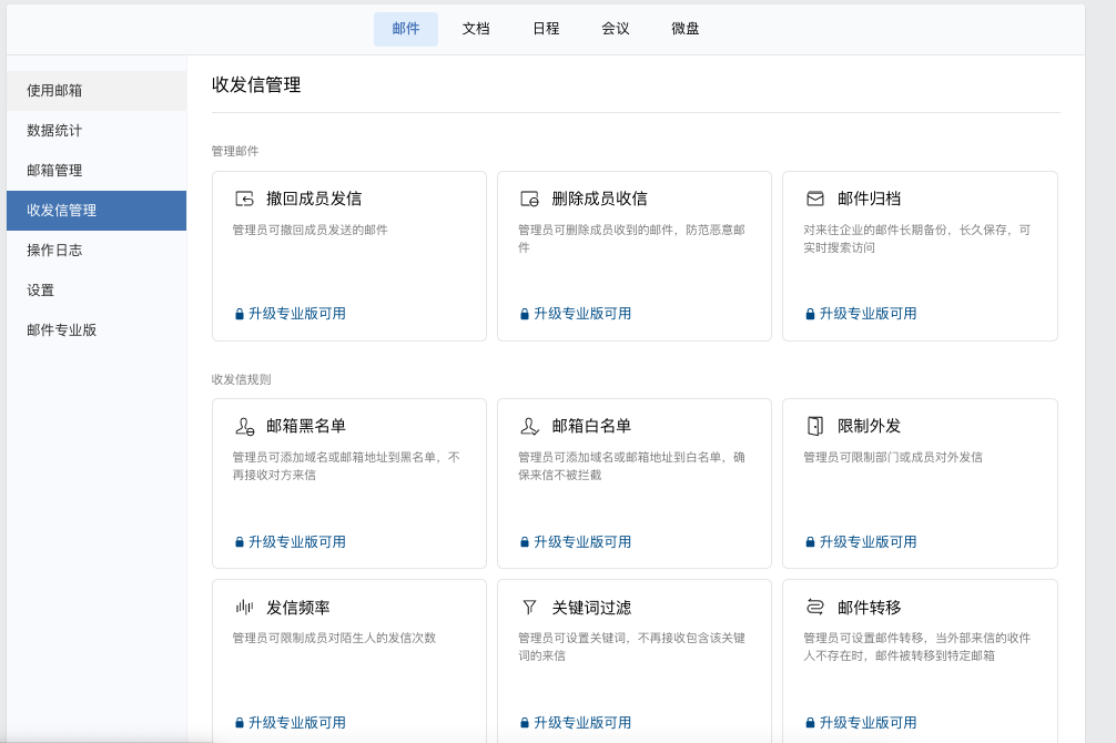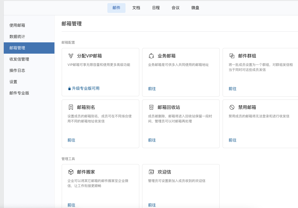 登录企业微信管理后台,在“协作-邮件”中可以使用丰富专业的管理端功能。