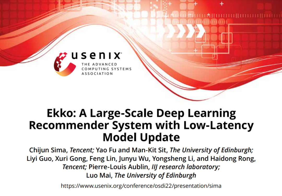 OSDI(操作系统设计与实现研讨会,Operating Systems Design and Implementation)是计算机系统软件领域全球最顶级会议之一,被誉为操作系统原理领域的奥斯卡,拥有极高的学术地位,由 USENIX 主办。据了解,本届会议共 253 篇投稿论文,接收 49 篇,接收率约为 19.4%。《Ekko: A Large-Scale Deep Learning Recommender System with Low-Latency Model Update》成为了腾讯首篇入选该会议的论文。