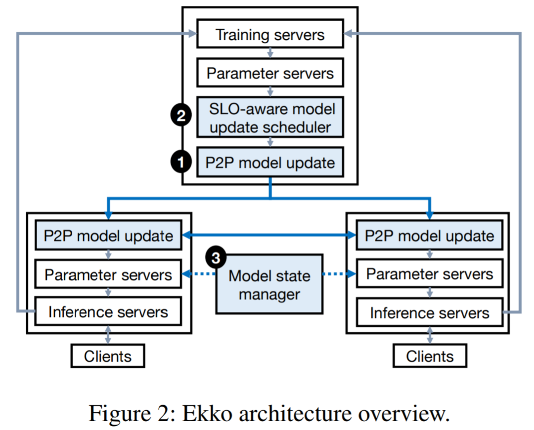 Ekko 可以防止 Freshness SLO 、Quality SLO 受到网络拥塞的影响,这是通过 SLO 感知模型更新调度器以及将该调度器集成到 P2P 模型更新传播来实现的。