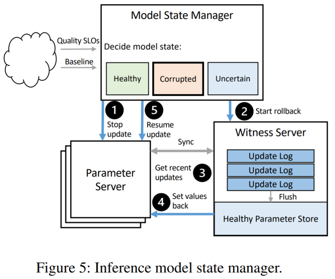 Ekko 使用推理模型状态管理器来保护 SLO 免受有害的模型更新。该管理器监控推理模型的健康状况(即 quality SLO)并按需进行低延迟模型状态回滚。下图 5 说明了回滚模型状态的过程。